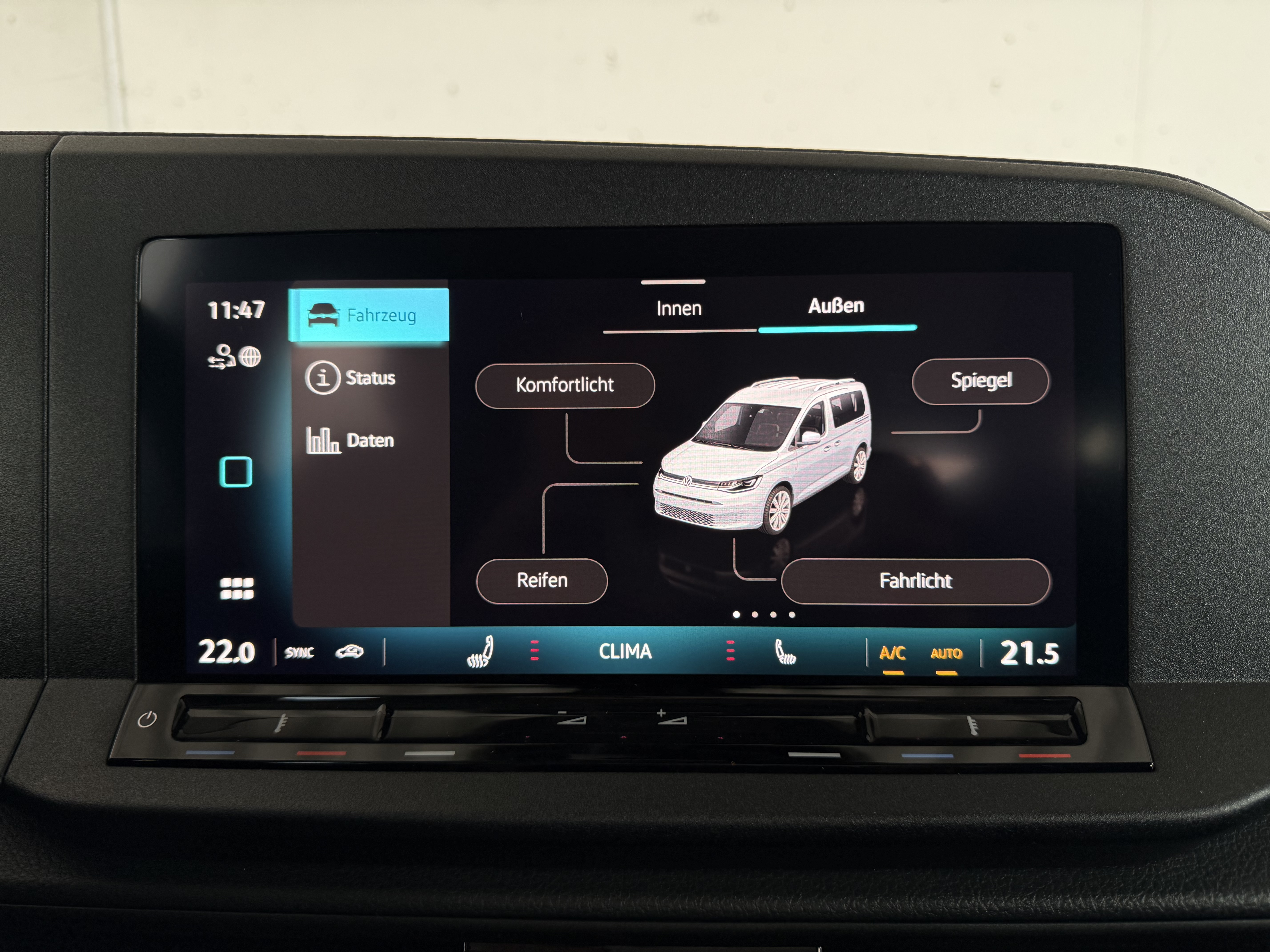 Ausstattung überspringen 3 % Unternehmerbonus 6-Gang-Schaltgetriebe Ablenkungs- und Müdigkeitserkennung Airbag für Fahrer und Beifahrer Airbag, Seiten- und Kopfairbags vorne Antrieb, Frontantrieb App-Connect inkl. Wireless Außenspiegel elektrisch anklappbar Außenspiegelgehäuse in Schwarz lackiert Ausweichunterstützung Automatische Distanzregelung Bodenbelag im Fahrerhaus, Teppich Bodenbelag im Fahrgastraum, Teppich Bremsassistent Bremskraftverstärker Cockpit-Blende matt Coming-Home-Funktion Dachgalerie im Fahrerhaus (Ablageschale) Dachreling, Schwarz Digital Cockpit Digitaler Radioempfang (DAB+) Digitales Bordhandbuch Dreipunkt-Autom.-Sicherheitsgurte vorne Einparkhilfe im Heckbereich ESC (elektr. Stabilisierungskontrolle) Fahrer- und Beifahrerairbag Fahrerairbag Fahrlichtschaltung, automatisch Fenster ab B-Säule abgedunkelt Fenster, Fahrgastraum links hinten Fenster, Fahrgastraum links vorne Fenster, Fahrgastraum rechts hinten Fenster, Fahrgastraum rechts vorne Fenster, Heckfenster beheizbar Fensterheber vorne, elektrisch Frontscheibe in Wärmeschutzglas Füllmenge des Kraftstofftanks ca. 50L Gepäckraumabdeckung Gurtanschnallwarnung Halogen-Doppelscheinwerfer H7 Handschuhfach mit Klappe, beleuchtet Heckscheiben Wisch-Waschanlage Innenbeleuchtung Fahrgastraum LED Innenspiegel, abblendbar Instrumenteneinsatz (km/h) Kältemittel R1234yf Kennzeichenbeleuchtung LED Kindersicherung elektrisch Kindersitzverankerung Kindersitzverankerung Beifahrersitz Klimaanlage "Air Care Climatronic" Kopfairbags Kraftstoffsystem Otto-Einspritzer Kreuzungsassistent Landessetzung Lautsprecher, 6 Stück Leuchtweitenregulierung Licht- und Sicht-Paket Lichtsensor Luftausströmer, vorne Mittelarmlehne vorne, verstellbar Mobiltelefon-Schnittstelle Multifunktions-Lederlenkrad Multifunktionskamera Multifunktionslenkrad Nichtraucherausführung Notbremsassistent "Front Assist" Notrufsystem eCall Ohne externe elektrische Schnittstelle Ohne Lehnenentriegelung für Vordersitze Ohne Schnittstelle für externe Nutzung Parkbremse, elektronisch Räder Stahl 6,5 J x 16 Radio "Composition" Radvollblenden Regensensor Reifen ohne Festlegung der Reifenmarke Reifenkontrollanzeige Schalthebel in Leder Scheibenbremsen hinten, 15 Zoll Scheibenbremsen vorne, 16 Zoll Scheibenwaschdüsen beheizbar Scheibenwischer-Intervallschaltung Schlüssel (2 Stück) für Schließsystem Schriftzüge für Typ-/Modellbezeichnung Seitenairbags vorne Seitenverkleidung Komfort Servotronic Sicherheitsgurte im Fahrgastraum Sitz, Fahrer höhenverstellbar Sitzbezug Stoff "Double Grid" Sitze, 3 Sitzplätze in der 2. Sitzreihe Sitzheizung vorne Sonnenblenden mit Spiegel Speedlimiter prädiktiv Spurhalteassistent Spurhalteassistent "Lane Assist" Spurwechselassistent "Side Assist" Start-Stopp-System Steckdose 12 Volt, im Laderaum Steinschlag-Schutz Unterboden Steuerungsnummer Stoßfänger in Wagenfarbe lackiert Tagfahrlicht Tire Mobility Set Tür, Heckklappe mit Fenster Tür, Schiebetür im Fahrgastraum, links Tür, Schiebetür im Fahrgastraum, rechts USB-Schnittstellen (Typ C) Verkehrszeichenerkennung Vorbereitung Alcohol Interlock Vorbereitung für "VW Connect/Plus" Wärmeschutzglas (Grün) Wartungsintervall-Verlängerung Wegfahrsperre elektronisch Winterpaket mit beheizbarer Frontscheibe Zentralverriegelung/FFB+Innenbetätigung Zulässiges Gesamtgewicht 2.150 kg Zusätzliche Staubschutz-Dichtung außen Mehr anzeigen