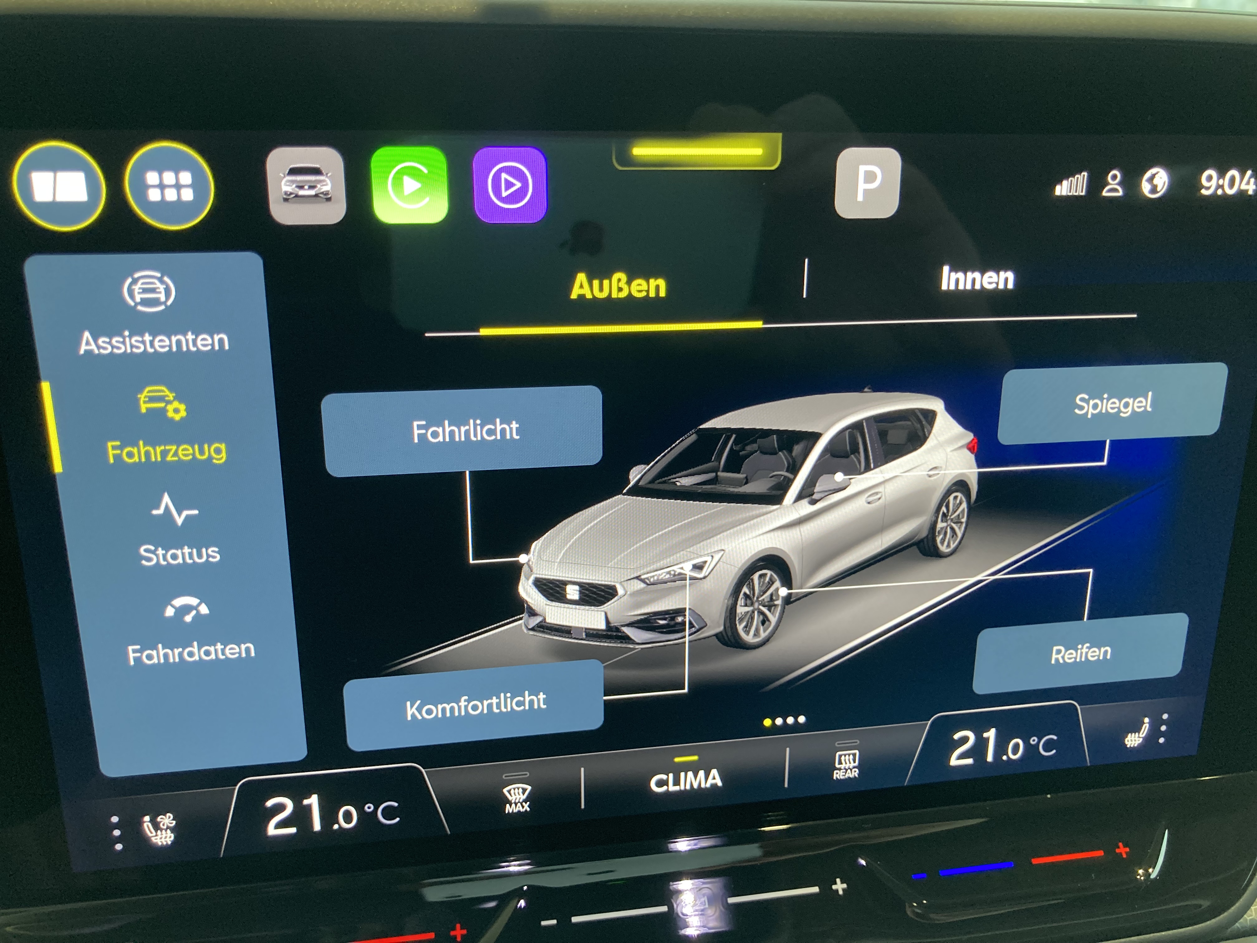 Ausstattung überspringen 1-Zonen-Klimaanlage "Climatronic" 2x USB-C vorne 3-Punkt-Sicherheitsgurte 5 Jahre / 100.000 km Garantie 5 Jahre / 100.000 km Garantie 6 Lautsprecher Airbag für Fahrer und Beifahrer Alkohol-Interlock Vorbereitung Anhängevorrichtung Anhängevorrichtung Vorbereitung Antenne für Radio App Connect Apple CarPlay Außenspiegel elektr. verstell-/beheiz- Außenspiegel und Türgriffe in Wagenfarbe Ausweich- und Abbiegeassistent Bluetooth-Freisprecheinrichtung Bordwerkzeug Chromelemente im Innenraum Climatronic Coming-Home-Funktion Dachhimmel grau Design-Paket Style Differentialsperre (XDS) Digitaler Radioempfang (DAB) Digitales Cockpit 8" Basic E-Call Notruf Einstiegsleisten aus Kunststoff Einton-Signalhorn Elektronische Handbremse mit Auto-Hold Felgen Alu 16" "Design Style" Fensterheber elektrisch vorne & hinten Fensterschachtleisten schwarz Front Assist Ganghebel in Leder (Vegan) Gepäckraumabdeckung Geschwindigkeitsbegrenzer Gurtanschnallkontrolle auf allen Haltegriffe am Dachhimmel Heckscheiben Wisch-/Waschanlage Heckspoiler Innenspiegel automatisch abblendend Kindersitzbefestigung für I-Size Komfortfahrwerk Komfortsitze Kopfthorax-Airbags vorne und hinten Kreuzungsassistent Kühlergrilleinfassung in Chrom LED Innenraumbeleuchtung LED-Nebelscheinwerfer mit Abbiegelicht LED-Rückleuchten Lendenwirbelstütze für Fahrersitz Lenkrad beheizbar Leseleuchten LED vorne und hinten Leuchtweitenregulierung manuell Lichtsensor Lichtsensor Luftausströmerumrandung in Schwarz Media System 10,4" (26,4cm) Mittelarmlehne vorne Müdigkeits- und Ablenkungserkennung Multifunktionslenkrad in Leder Multikollisionsbremse Nebelschlussleuchte Österreich-Paket Style Park Lenkassistent Parksensoren vorne und hinten Preisschutz Radschrauben Standard Rechtshinweise mobile Online-Dienste Regensensor Reifen 205/55 R16 Reifendruckkontrolle Rückfahrkamera Rücksitzlehne geteilt umlegbar(1/3:2/3) Scheibenbremsen hinten Scheibenbremsen vorne SEAT CONNECT 3.0 Seitenfenster ab B-Säule abgedunkelt Servolenkung elektro-mechanisch Sitzbezug Stoff Sitzheizung vorne Sonnenblenden mit Spiegel Spracherkennung Spurhalteassistent Start-Stopp-System Startknopf mit Heartbeat Stoßfänger in Wagenfarbe STYLE Ausführung Taschen an der Rückseite der Vordersitze Tempomat Tire-Mobility-Set Verkehrszeichenerkennung Voll-LED-Scheinwerfer (ECO) inkl. Vordersitze höhenverstellbar Wärmeschutzverglasung Wärmeschutzverglasung Frontscheibe Wegfahrsperre elektronisch Zentralairbag zwischen den Vordersitzen Zierleiste am Armaturenbrett in Grau Mehr anzeigen