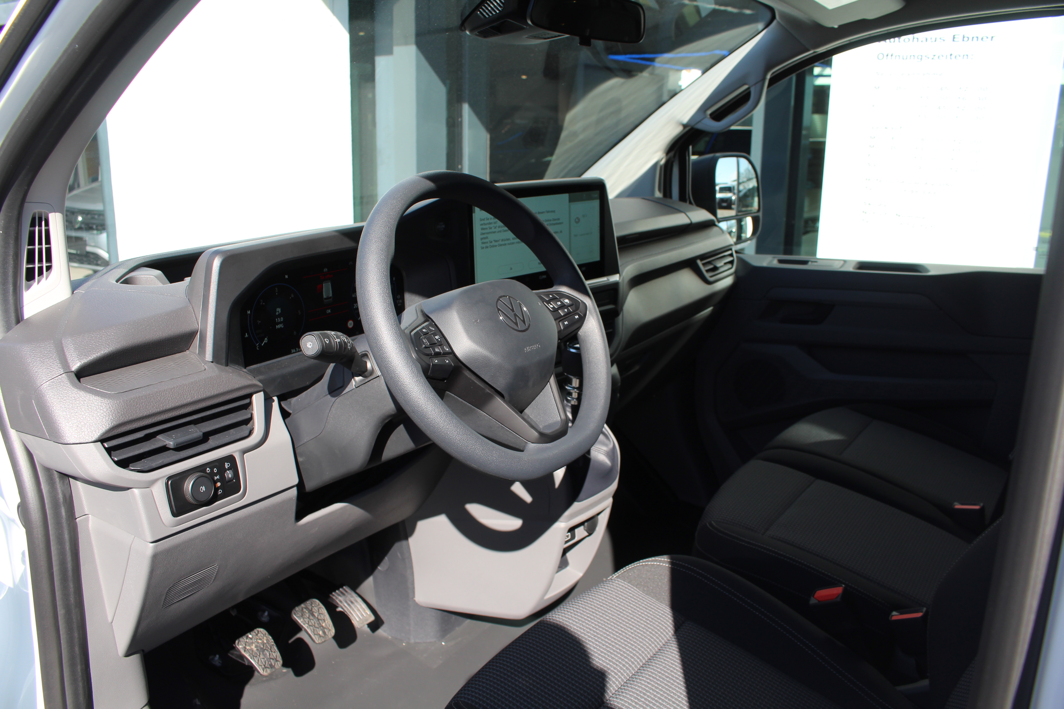 Ausstattung überspringen 2 % Loyalitätbonus 5G Modem 6 % Unternehmerbonus Abgasnorm Euro 6e EB Airbag für Fahrer und Beifahrer Anhängevorrichtung Anhängevorrichtung starr Anschlussgarantie 2+3 Jahre, 250.000 km Außenspiegel, beheizbar Außenspiegelgehäuse/Türgriffe in schwarz Batterie, AGM-Fahrzeugbatterie 80 Ah Bodenbelag Fahrerhaus, Gummi Bodenbelag Laderaum, Holz Dachkonsole klein Digitales Cockpit Doppeltonsignalhorn Einstiegleiste Schiebetür Kunststoff Einstiegshilfe an der A-Säule BFS ESP elektron. Stabilisierungsprogramm Fahrerassistenzpaket Fernlichtassistent "Light Assist" Fixierpunkt nach AMPS-Standard Frontscheibe in Verbundsicherheitsglas Generator 230 A Geschwindigkeitsregelanlage Haltegriffe am Dachrahmen Handschuhfach mit Klappe Handschuhfach, abschließbar Heckfenster beheizbar Heckscheiben Wisch-Waschanlage Heiz- und Belüftungsanlage Klimaanlage Fahrerhaus Kopfstützen höhenverstellbar Kühlergrill in Clear White Kühlergrill in Wagenfarbe lackiert Landessetzung Lautsprecher, 4 Stück LED-Hauptscheinwerfer LED-Leuchten im Dachhimmel LED-Leuchten im Fahrerhaus LED-Rückleuchten ME-Funktionsfahrzeug Mittelkonsole schmal Mobiltelefon-Schnittstelle Müdigkeitserkennung Multifunktionslenkrad Notbremsassistent Notrufsystem eCall Ohne Beschleunigungsbeg./Anfahrunt. Ohne Dachreling/Dachlastträger Ohne Sitze im Laderaum ParkPilot hinten Radabdeckung Mitte Radio mit Touch-Farbdisplay Radschrauben Standard Radvollblenden 16" Reifen 215/65 R16 C 109 T Reifendruck-Kontrollsystem Reserverad in Fahrbereifung Reserverad in Fahrbereifung, Stahlfelge Schalthebelknauf Kunststoff Scheibenwischer-Intervallschaltung Schmutzfänger vorne Schriftzug "Transporter" am Heck Seitenverkleidung im LDR, halbhoch Sicherheitsinnenspiegel, manuell Sitzbezug in Stoff gestreift Sitze, Beifahrerdoppelsitzbank Sitzpaket mit Beifahrerdoppelsitzbank Spurhalteassistent "Lane Assist" Steckdose 12V in der Mittelkonsole Steuerung Sitzpaket Steuerungsnummer Steuerungsnummer Stoßfänger grau, unlackiert Tankvolumen 55 Liter Tankvolumen 70 Liter Tire Mobility Set Trennwand hoch, mit festem Fenster Trimlevel Basis Tür, Heckklappe mit Fenster Tür, Schiebetür im LDR rechts Typschild für Nutzfahrzeug-Zulassung N1 USB-Daten-/Ladesteckdosen 15W (2 Stück) Verbandsmaterial, Warndreieck, Warnweste Verkehrszeichenerkennung Verzurrösen (6 Stück) Vorbereitung Alcohol Interlock Wärmeschutzverglasung Wegfahrsperre elektronisch Zentralverr. "Keyless Start" Zulässiges Gesamtgewicht 2.770 - 2.845kg Mehr anzeigen