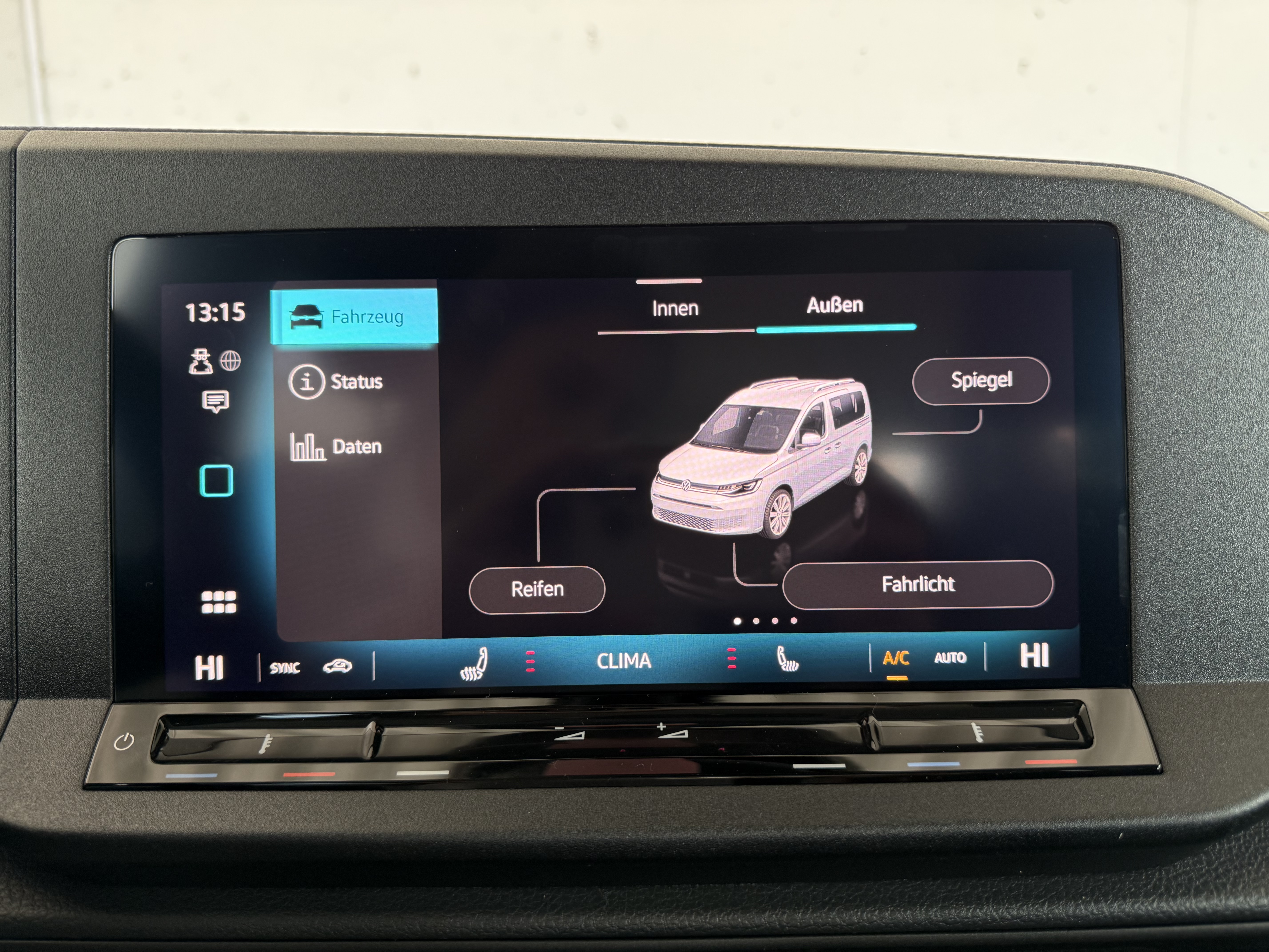 Ausstattung überspringen 3 % Unternehmerbonus 6-Gang-Schaltgetriebe Abgaskonzept, WLTP3 N1 EU6EB Ablenkungs- und Müdigkeitserkennung Airbag für Fahrer und Beifahrer Airbag, Seiten- und Kopfairbags vorne Anhängerkupplung Vorbereitung Anhängevorrichtung Vorbereitung Antrieb, Frontantrieb App-Connect inkl. Wireless Außenspiegel elektrisch anklappbar Außenspiegelgehäuse in Schwarz lackiert Ausweichunterstützung Automatische Distanzregelung Bodenbelag im Fahrerhaus, Teppich Bodenbelag im Fahrgastraum, Teppich Bremsassistent Bremskraftverstärker Cockpit-Blende matt Dachgalerie im Fahrerhaus (Ablageschale) Dachreling, Schwarz Digital Cockpit Digitaler Radioempfang (DAB+) Digitales Bordhandbuch Dreipunkt-Autom.-Sicherheitsgurte vorne Einparkhilfe im Heckbereich Entfall DAB+ ESC (elektr. Stabilisierungskontrolle) Fahrer- und Beifahrerairbag Fahrerairbag Fahrlichtschaltung, automatisch Fenster ab B-Säule abgedunkelt Fenster, Fahrgastraum links hinten Fenster, Fahrgastraum links vorne Fenster, Fahrgastraum rechts hinten Fenster, Fahrgastraum rechts vorne Fenster, Heckfenster beheizbar Fensterheber vorne, elektrisch Frontscheibe in Wärmeschutzglas Füllmenge des Kraftstofftanks ca. 50L Gepäckraumabdeckung Gurtanschnallwarnung Halogen-Doppelscheinwerfer H7 Handschuhfach mit Klappe, beleuchtet Heckscheiben Wisch-Waschanlage Innenbeleuchtung Fahrgastraum LED Innenspiegel, abblendbar Instrumenteneinsatz (km/h) Kältemittel R1234yf Kennzeichenbeleuchtung LED Kindersicherung elektrisch Kindersitzverankerung Kindersitzverankerung Beifahrersitz Klimaanlage "Air Care Climatronic" Kopfairbags Kraftstoffsystem Diesel Kreuzungsassistent Landessetzung Lautsprecher, 6 Stück Leuchtweitenregulierung Luftausströmer, vorne Luftzusatzheizung, elektrisch Mittelarmlehne vorne, verstellbar Mobiltelefon-Schnittstelle Multifunktions-Lederlenkrad Multifunktionskamera Multifunktionslenkrad Nichtraucherausführung Notbremsassistent "Front Assist" Notrufsystem eCall Ohne externe elektrische Schnittstelle Ohne Lehnenentriegelung für Vordersitze Ohne Schnittstelle für externe Nutzung Parkbremse, elektronisch Räder Stahl 6,5 J x 15 Radio "Composition" Radvollblenden Reifen ohne Festlegung der Reifenmarke Reifen, 205/65 R15 99H XL Reifenkontrollanzeige Schalthebel in Leder Scheibenbremsen hinten, 15 Zoll Scheibenbremsen vorne, 15 Zoll Scheibenwischer-Intervallschaltung Schlüssel (2 Stück) für Schließsystem Schriftzüge für Typ-/Modellbezeichnung Seitenairbags vorne Seitenverkleidung Komfort Servotronic Sicherheitsgurte im Fahrgastraum Sitz, Fahrer höhenverstellbar Sitzbezug Stoff "Double Grid" Sitze, 3 Sitzplätze in der 2. Sitzreihe Sonnenblenden mit Spiegel Speedlimiter prädiktiv Spurhalteassistent Spurhalteassistent "Lane Assist" Spurwechselassistent "Side Assist" Start-Stopp-System Steckdose 12 Volt, im Laderaum Steinschlag-Schutz Unterboden Steuerungsnummer Stoßfänger in Wagenfarbe lackiert Tire Mobility Set Tür, Heckklappe mit Fenster Tür, Schiebetür im Fahrgastraum, links Tür, Schiebetür im Fahrgastraum, rechts USB-Schnittstellen (Typ C) Verkehrszeichenerkennung Vorbereitung Alcohol Interlock Vorbereitung für "VW Connect/Plus" Wärmeschutzglas (Grün) Wartungsintervall-Verlängerung Wegfahrsperre elektronisch Winterpaket Zentralverriegelung/FFB+Innenbetätigung Zulässiges Gesamtgewicht 2.220 kg Zusätzliche Staubschutz-Dichtung außen Mehr anzeigen