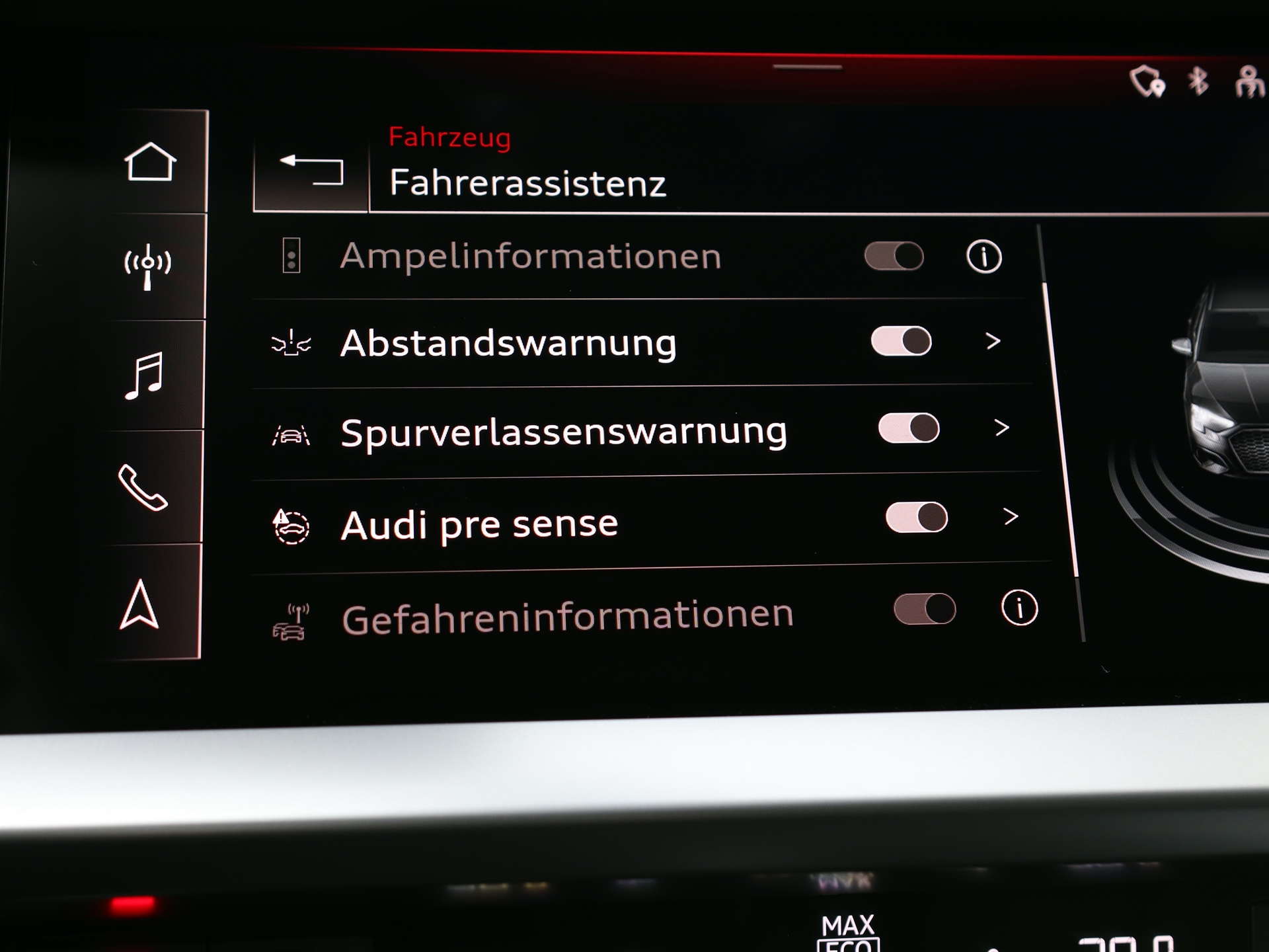 Ausstattung überspringen 2-Zonen-Komfortklimaautomatik 3-Punktgurte auf allen Sitzplätzen 4 Zyl.Ottomotor 1,5L Aggr. 05E.A 4-Wege-Lendenwirbelstütze für die Vordersitze 7-Gang-Automatikgetriebe 8fach Bereifung Abgaskonzept, EU6 AP Ablage- und Staukasten Mittelarmlehne ABS Acoustic Parking System advanced Airbag für Beifahrer abschaltbar Airbags vorn, Beifahrerairbag deaktivierbar Aktivkohlebehälter (EVAP) Ambiente-Lichtpaket App Connect Apple CarPlay ASR Audi AG Audi connect Navigation & Infotainment on Demand Audi connect Notruf & Service mit Audi connect Remote & Control Audi phone box light Audi pre sense front Audi Soundsystem Außenspiegel beheizbar Außenspiegel elektrisch einstell- und beheizbar Außenspiegel elektrisch verstellbar Außenspiegelgehäuse in Wagenfarbe Außentemperaturanzeige Ausweichassistent und Abbiegeassistent Bluetooth Bordcomputer Bremsassistent Car Connectivity Climatronic Coming-Home-Funktion Dachhimmel in Stoff in spezifischer Farbe Dekoreinlagen Seideneffektlack platingrau Digitaler Radioempfang Digitales Display Digitales Kombiinstrument Drehzahlmesser Einstiegsleisten mit Aluminiumeinlegern vorn Elektromechanische Parkbremse Elektromechanische Servolenkung ESP Fahrer- und Beifahrerairbag Fahrzeuge ohne besonderen Produktaufwer-tungsmaßnahmen Fensterheber elektrisch hinten Fensterheber elektrisch vorne Fernbedienung für Zentralverriegelung Freisprecheinrichtung Frontscheibe in Wärmeschutzverglasung Geschwindigkeitsbegrenzungsanlage Geschwindigkeitsregelanlage mit Vorbereitung adaptiver Geschwindigkeitsassistent gesetzlicher Notruf geteilte Rückbank Glanzpaket Gurtanlegekontrolle mit Sitzbelegungserkennung hinten Handy-Vorbereitung Induktive Ladeschale für Smartphones Infotainment-Paket Kältemittel R1234yf Kindersicherung elektrisch betätigt Kindersitzbefestigung ISOFIX Kindersitzbefestigung ISOFIX vorn, Top Tether und i-Size für die äußeren Fondsitze Komfortsitz Kopfairbags vorne Kopfstützen hinten (3 Stück) Kopfstützen im Fond Kraftstoffsystem Otto-Einspritzer LED-Scheinwerfer LED-Tagfahrlicht Lederlenkrad 3-Speichen mit Multifunktion plus und Schaltwippen Ledersportlenkrad Leichtmetallfelgen 17 Zoll Lendenwirbelstütze Lenkrad höhenverstellbar Lenkrad neigungsverstellbar Licht-/Regensensor Lichtsensor Media-Schnittstelle Mit Multifunktionskamera Mittelarmlehne vorn Mittelarmlehne vorne MMI Radio plus Modellbezeichnung und Technologieschriftzug MP3 Player Müdigkeitserkennung Multifunktionsanzeige Multifunktionslenkrad Nichtraucherausführung Normalsitze vorn Notbremsassistent Notrufsystem / E-Call Ottomotor Park Distanz Kontrolle vorne und hinten Park Lenkassistent Parkassistent mit Einparkhilfe plus Parkhilfe hinten Parkhilfe vorne Räder, Vielspeichen, 8,0Jx17, Reifen 225/45 R17 Regensensor Reifen ohne Festlegung der Reifenmarke Reifendruck-Kontrollanzeige Reifendruckkontrolle Reifenreparaturset Rücksitzlehne umklappbar Schaltwippen Scheiben getönt Scheibenbremsen hinten, 15 Zoll (ECE) Scheibenbremsen vorn, 15 Zoll (ECE) Seitenairbags vorn mit Kopfairbagsystem und Interaktionsairbag vorn Seitenairbags vorne Seitenfenster ab B-Säule abgedunkelt Serviceanzeige 30000 km oder 2 Jahre ( variabel ) Serviceheft gepflegt Servotronik Sitz-Fahrer & Beifahrer höhenverstellbar Sitzbezug Stoff Sitzheizung vorn Sitzheizung vorne Smartphone-Interface Sonnenschutzverglasung abgedunkelt Soundsystem Sportlimousine Sprachsteuerung Spurhalteassistent Spurverlassenswarnung Stabilisator hinten Stabilisator vorn Stahlräder mit Radvollblende, 6,5Jx16, Winterreifen 205/55 R16 Start-Stop-System Start-Stopp-System Startknopf Stoff Index Stoßfänger advanced Tempomat Thermoverglasung Touchscreen USB Schnittstelle USB-Anschlüsse mit Ladefunktion im Fond UWB fähiges Land und Trägerfrequenz 433,92 bis 434,42Mhz Virtual Cockpit Vorbereitung für Functions on Demand Vordersitze manuell einstellbar Wartungsintervallverlängerung Wegfahrsperre elektrisch Wegfahrsperre elektronisch Winterreifen WLAN / Wifi Spot Mehr anzeigen
